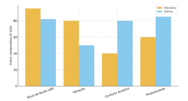 Para ilustrar comparativamente os resultados obtidos, elaborou-se o gráfico a seguir, que sintetiza os principais indicadores avaliados entre equipamentos hidráulicos e elétricos, considerando ruído, vibração, conforto acústico e produtividade. O recurso visual reforça os achados documentais e evidencia de forma objetiva as vantagens da eletrificação em ambientes fabris.
