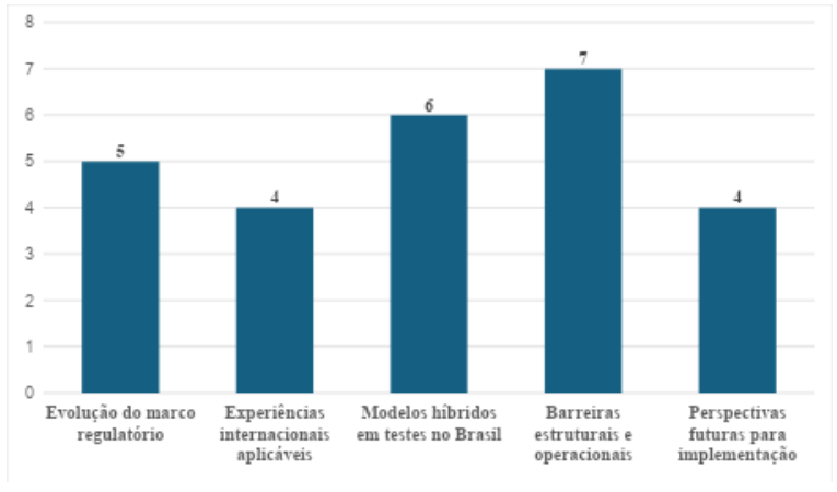 O eixo com maior incidência foi Barreiras estruturais e operacionais (7 menções), seguido por modelos híbridos em testes no Brasil (6). Isso indica que o texto dedica grande atenção tanto aos desafios concretos quanto às experiências práticas em andamento. Já os eixos de regulação e perspectivas futuras, embora relevantes, são discutidos com um volume ligeiramente menor de argumentos.
