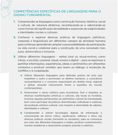 No tocante a isto, a BNCC ilustra este entendimento quando cita as competências específicas de linguagens para o Ensino Fundamental, (Brasil, 2018, pp. 65):
