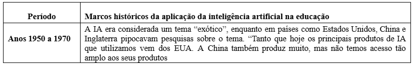 Com o objetivo de entender o processo de evolução da IA, Viccari (2023, p.23), construiu uma linha do tempo com a história da inteligência artificial na educação de 1950 até o ano de 2020.