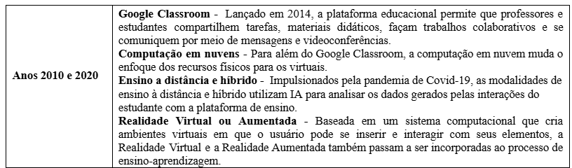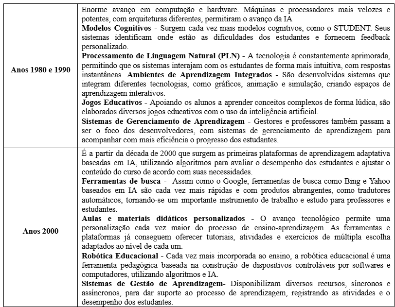 Conforme foi visto, a tabela mostra os principais avanços da inteligência artificial na educação. Viccari (2023) também enfatiza que,  após este pontapé inicial, é a partir dos anos 1980 que pesquisadores passam a explorar com mais afinco o potencial da tecnologia, sempre com o argumento de personalizar o ensino e adaptá-lo às necessidades individuais dos estudantes.