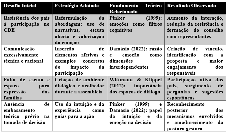 Para sistematizar os principais achados da experiência relatada, a seguir apresenta-se uma tabela que organiza os elementos centrais observados durante o processo de mobilização dos pais para o Conselho Deliberativo Escolar (CDE). A tabela contempla os desafios enfrentados, as estratégias adotadas, os fundamentos teóricos que dialogam com a prática e os resultados alcançados. Essa síntese permite visualizar, de forma clara, como a tomada de decisão na gestão escolar pode ser aprimorada quando há sensibilidade às dimensões emocionais e abertura para a escuta ativa.