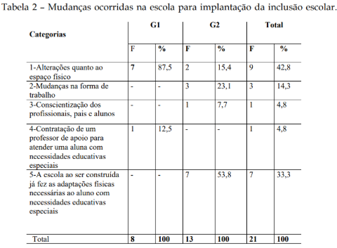 Mudanças Ocorridas na Escola para Implantação da Inclusão Escolar (Tabela 2)