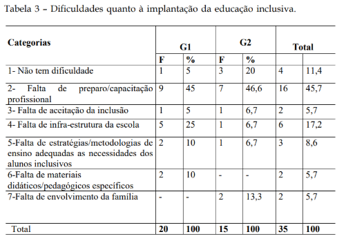 Dificuldades na Implantação da Educação Inclusiva (Tabela 3)