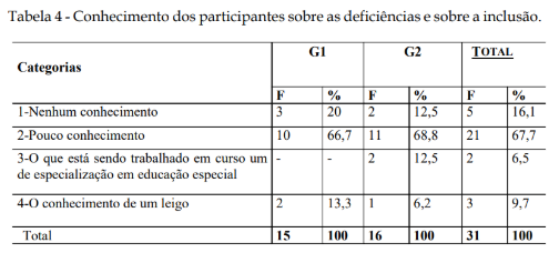 Conhecimento dos Participantes sobre Deficiências e Inclusão (Tabela 4)