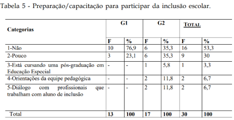Preparação e Capacitação para a Inclusão Escolar (Tabela 5)