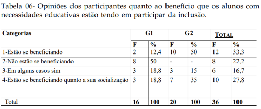 Opiniões sobre os Benefícios da Inclusão para Alunos com Necessidades Educativas (Tabela 6)