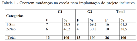 Mudanças na Escola para a Implantação do Projeto Inclusivo (Tabela 1)
